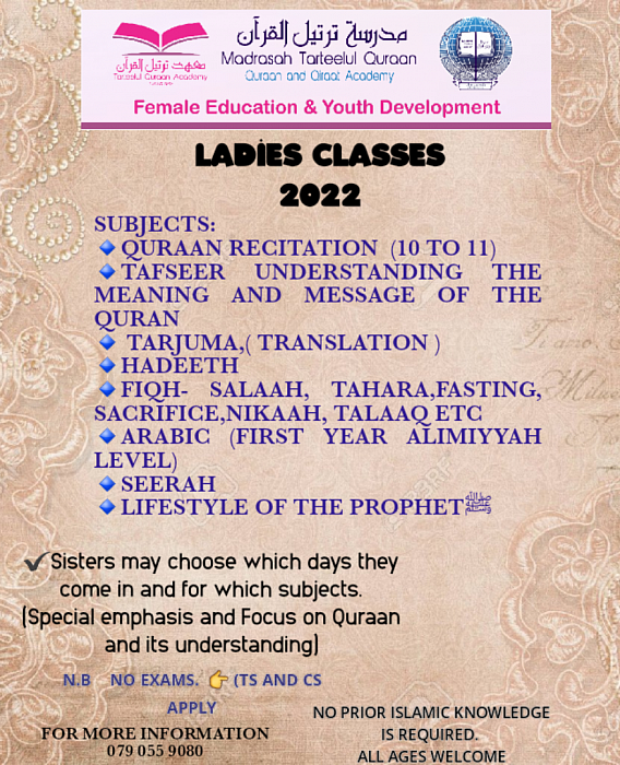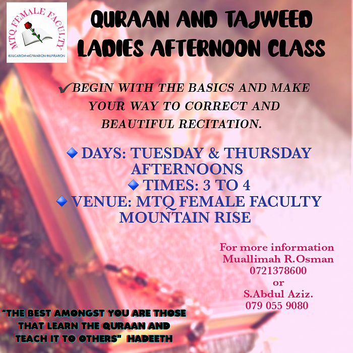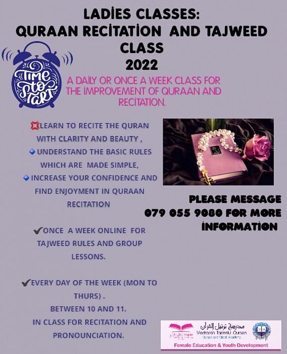 QURAAN RECITATION IMPROVEMENT AND TAJWEED REFRESHER. Attend the morning classes and have your recitation checked and improved. Improve your presentation, pace and learn how to beautify the recitation. Individual attention is given to each student to ensure that quality is maintained and the student benefits optimally. Classes for 2023 will take place 10 to 10.45 Mondays